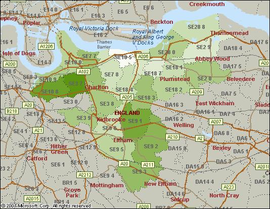 This is a map of mean annual household income for the postcode sectors which approximate to the local authority District of Greenwich. (Government admin boundaries are not part of Mappoint 2002.) The income data is imported not from within the package. For more information contact CACI Limited.