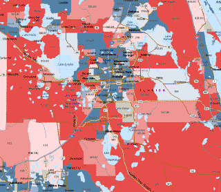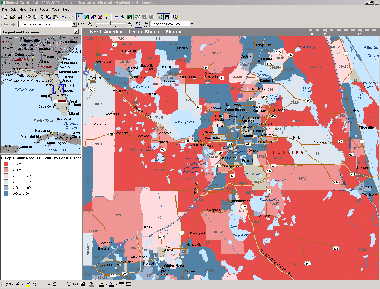 This maps shows projected population growth 2000-2005 by census tract in Orlando, Florida. Submitted by Geodezix.