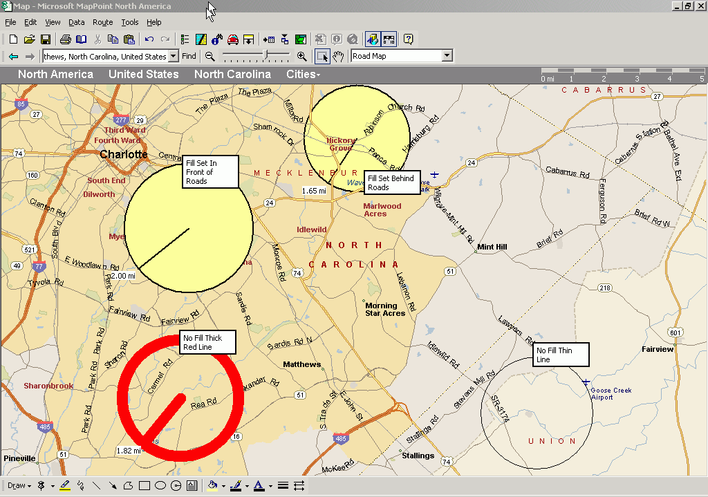 This is a demonstration of the radii drawing capability of MapPoint 2004.