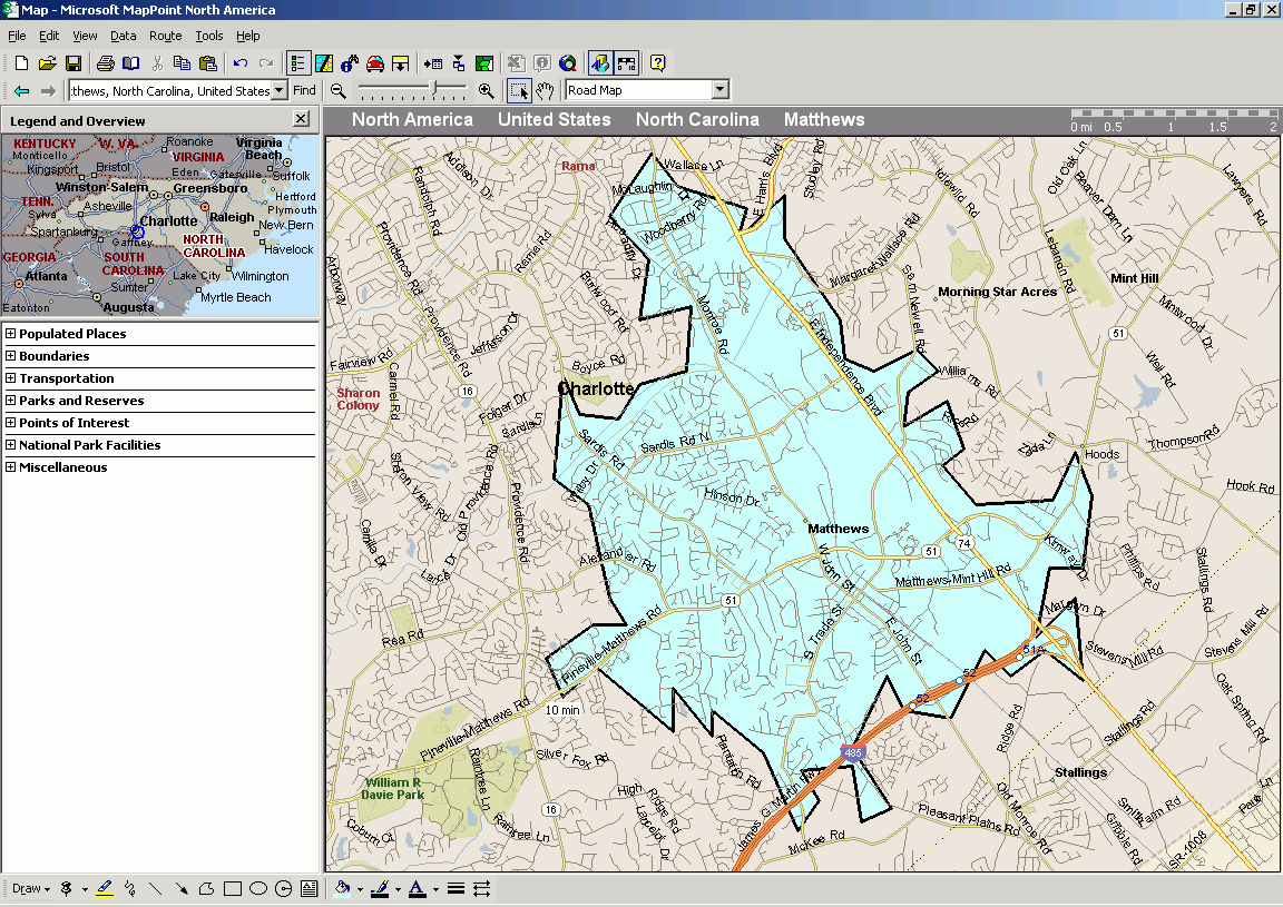MapPoint also has the capability of drawing drivetime zones showing the area within which a person could travel within a specified period of time. Here is an example: