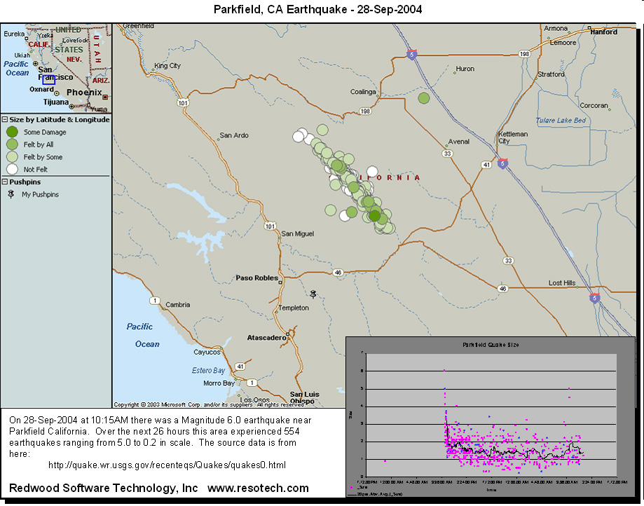 On September 28, 2004 there was a magnitude 6.0 earthquake near Parkfield, CA. Over the next 26 hours the surrounding area experienced 554 additional earthquakes.