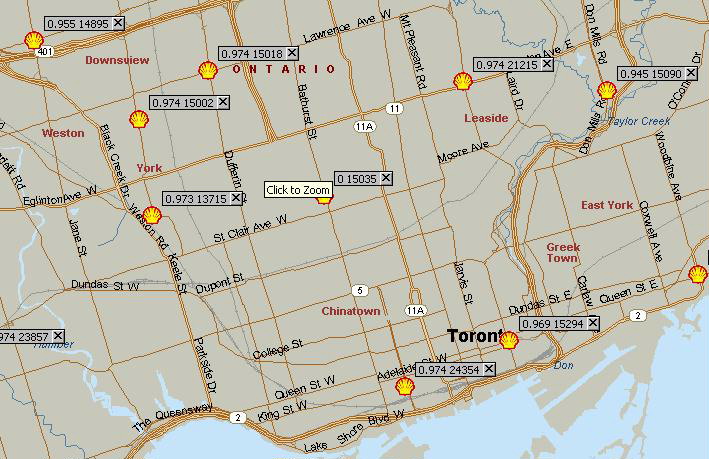 Using survey data stored in MBS Axapta this map is displaying current gasoline prices and gas station identification number in the selected area, using as criteria brand name. Data updated every 15 min. For more details about this map, please contact admin@scitechcom.com.