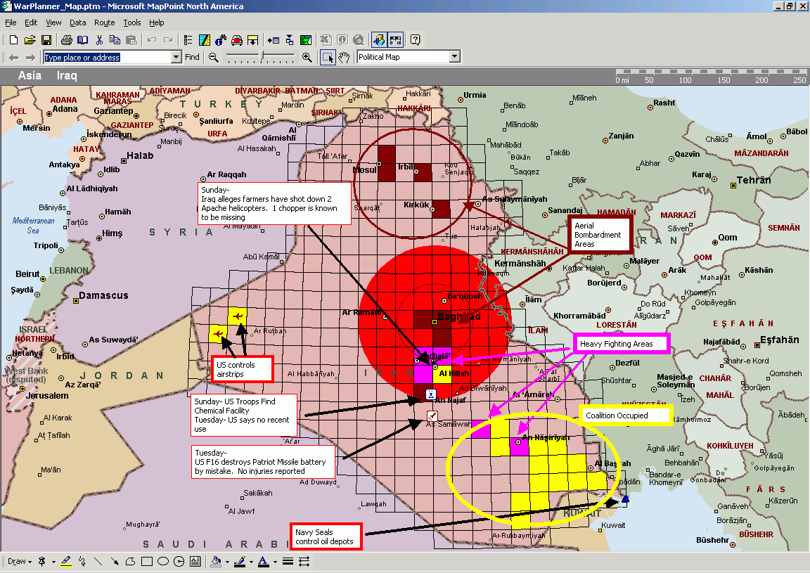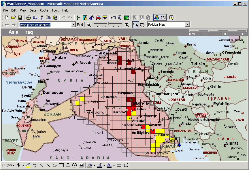 The maroon grids are areas that are receiving aerial bombardment, Red is heavy