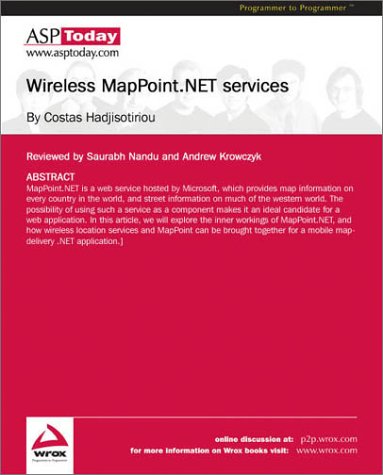 Siddharth Sharangpani' e-book is entitled "Providing GIS support to your applications using MapPoint .NET" and Costas Hadjisotiriou's is "Wireless MapPoint.NET services". The e-books were published by Wrox and are available for purchase ($8 each) and download on Amazon.